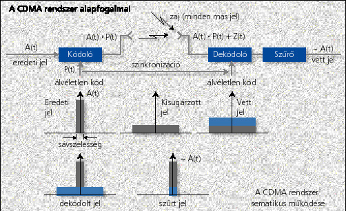 CDMA (Code Division Multiple Access kódosztásos többszörös hozzáférés): Akárcsak az FDMA vagy TDMA rendszerek esetében, a CDMA rendszernél is az a cél, hogy a frekvenciasávot több összeköttetés együttes átvitelére is használni tudjuk. Az FDMA rendszerek a frekvenciatartományt osztották több részre ennek érdekében, míg a TDMA rendszerek az idôtengelyt osztották fel idôrésekre a feladat megoldásához. A CDMA rendszerek a DS-SST technikának azt a tulajdonságát használják fel, hogy az adó és a vevô egy álvéletlen kódot használ az információ továbbításához, mely kód az adott kapcsolatra jellemzô. Ha a másik kapcsolat egy eltérô kódot használ, akkor használhatja ugyanazt a széles sávú frekvenciatartomány mindkettô, hiszen a vevô ki tudja választani, melyik információ érkezik a számára és melyik nem. A többszörös hozzáférést tehát nem a frekvencia, nem az idô, hanem a kódok felosztásával valósítja meg, innen ered a név.