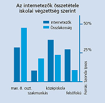 A hazai internet-statisztikát Karajánnisz Manolisz, a Szonda Ipsos munkatársa mutatta be 1998. I. félév regisztrációja alapján (mintanagysága: 10560 fô, alapsokaság: az ország 14 évesnél idôsebb lakossága), amelyben az internetezôk összetételének átlagéletkora 30,2 év. Az internet-hozzáférési lehetôség átlagosan 10 százalék. Nemek szerinti megoszlásban a férfiak 54, a nôk 46 százaléka internet-használó.